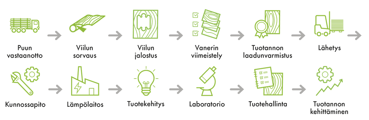 Puolet syntyvästä lämpöenergiasta käytetään muun muassa viilun kuivaukseen, levyjen kuumapuristukseen ja tukkien hautomoaltaan lämmitykseen. Toisen puolen tuotetusta energiasta hyödyntää naapurissa sijaitseva elintarviketeollisuusyritys, jonka kanssa on tehty vuosikymmeniä yhteistyötä.