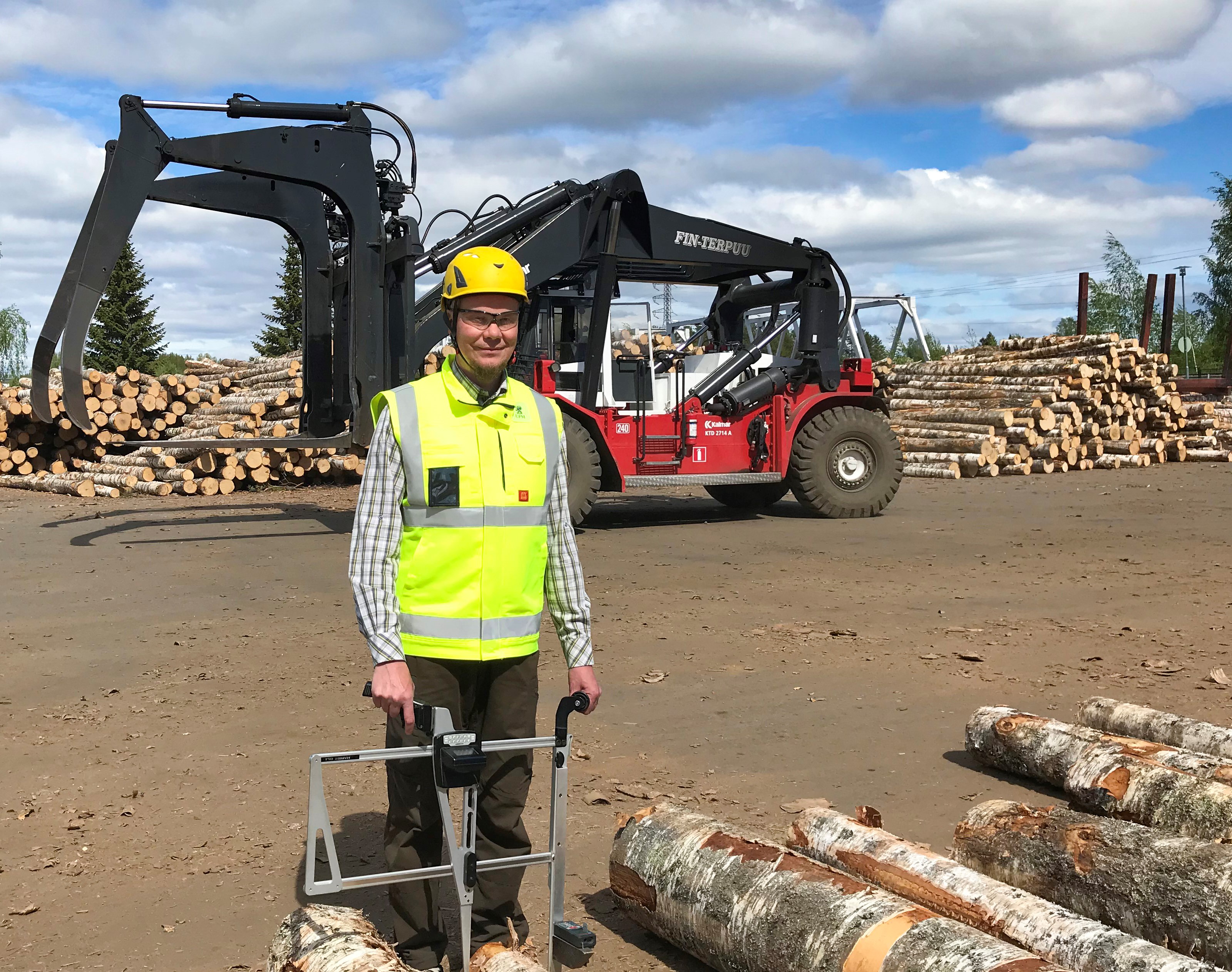 Vesa assesses the logs' quality: the wood must be of the highest quality, as it will be used to make WISA birch plywood for demanding end-use applications in LNG carriers, and WISA-Trans for trailer floors.